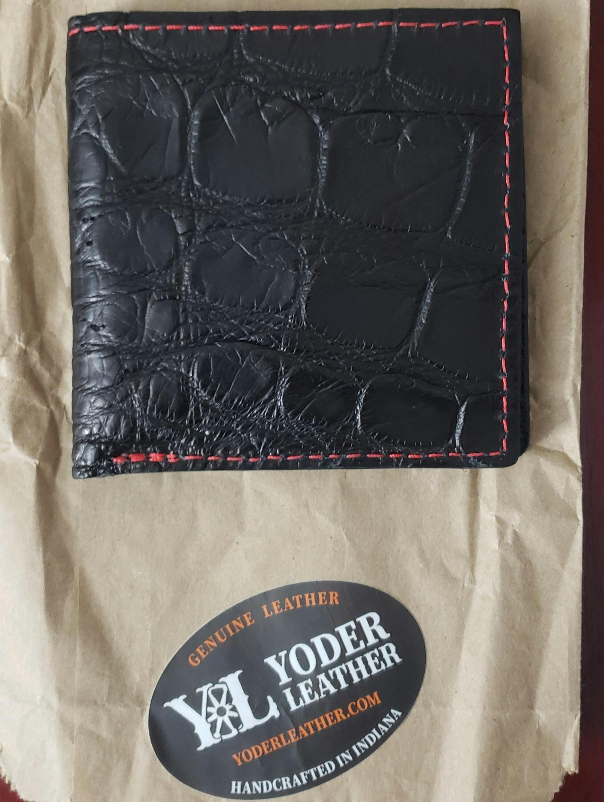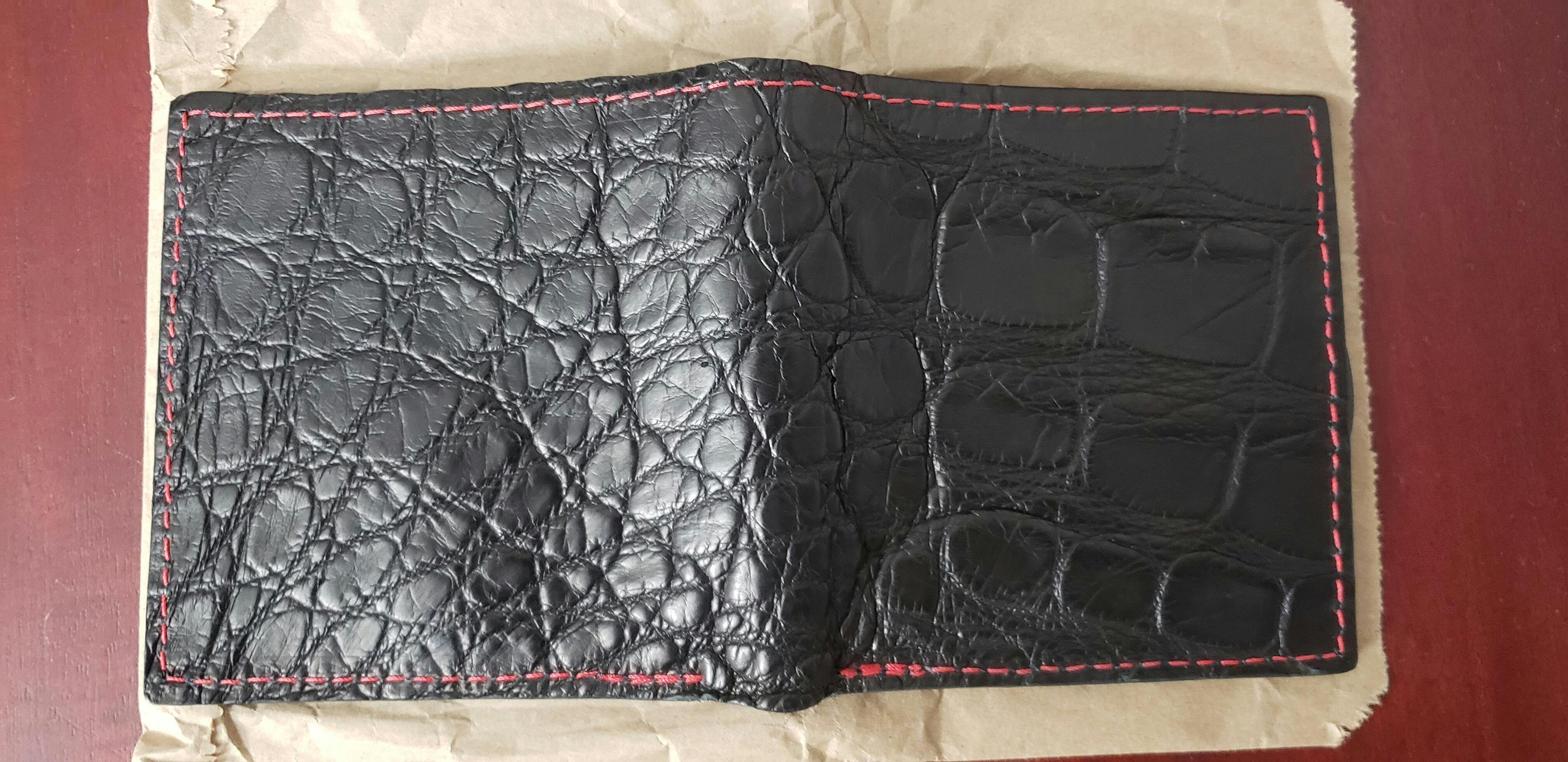 This black hipster wallet is handcrafted from the highest quality American Alligator leather available. The inner lining is a layer of supple top grade lining leather. The top grade interior has 12 credit card slots and a large money pocket with a separator down the middle creating two pockets for cash. You can also hold more credit cards or similar sized items in the three slots behind the credit cards.