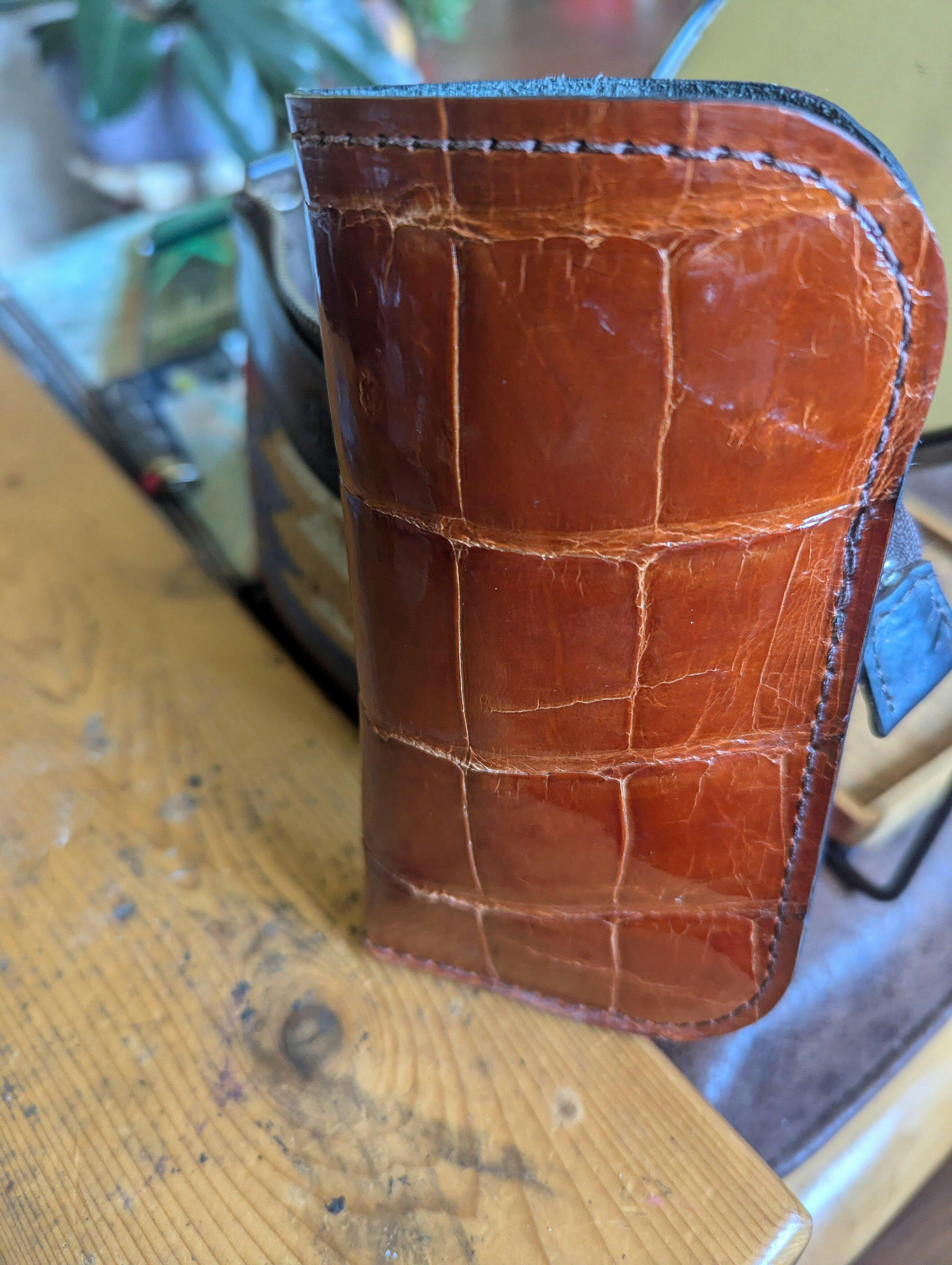 This soft leather glasses case is made from the highest quality Florida Alligator Skin available. It is dyed cognac and has a glossy finish. It is stitched with heavy duty nylon thread that matches the color of the leather.