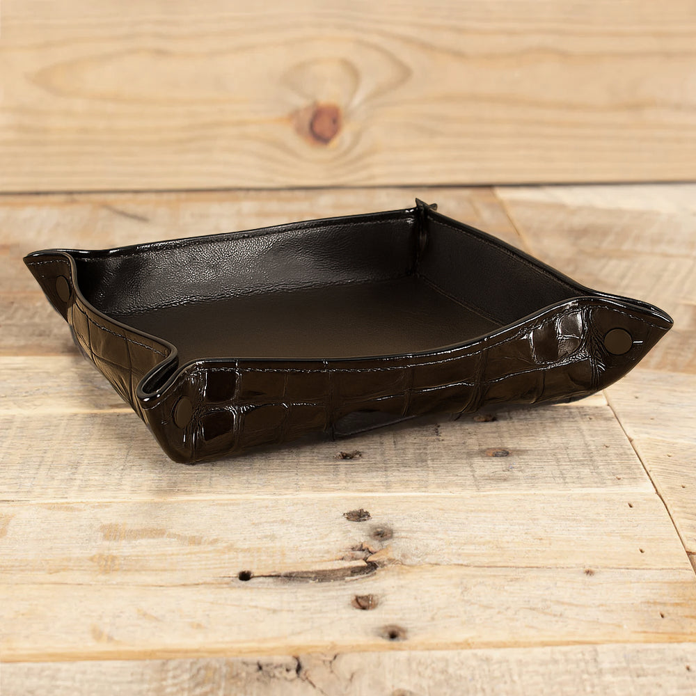 This valet tray is made with beautiful alligator skin that is dyed black. It uses four metal riveted snaps to create the walls. It is perfect for holding loose change, wallet, and other pocket items.