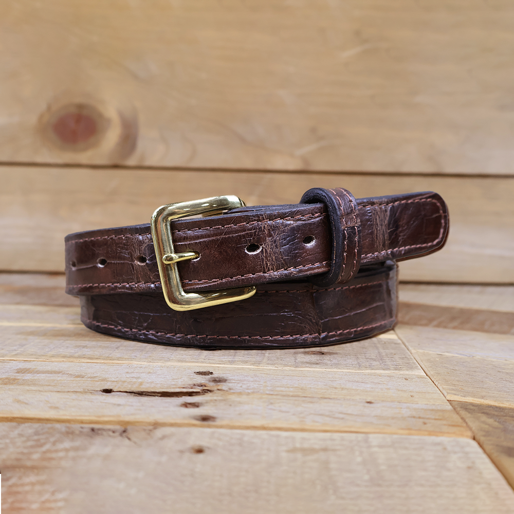Our belts are handcrafted from the highest quality alligator leathers available. These gator leather belts are made to order and crafted with our years of leather-working experience. This particular belt is tanned to bring out a rich brown look to the alligator leather.