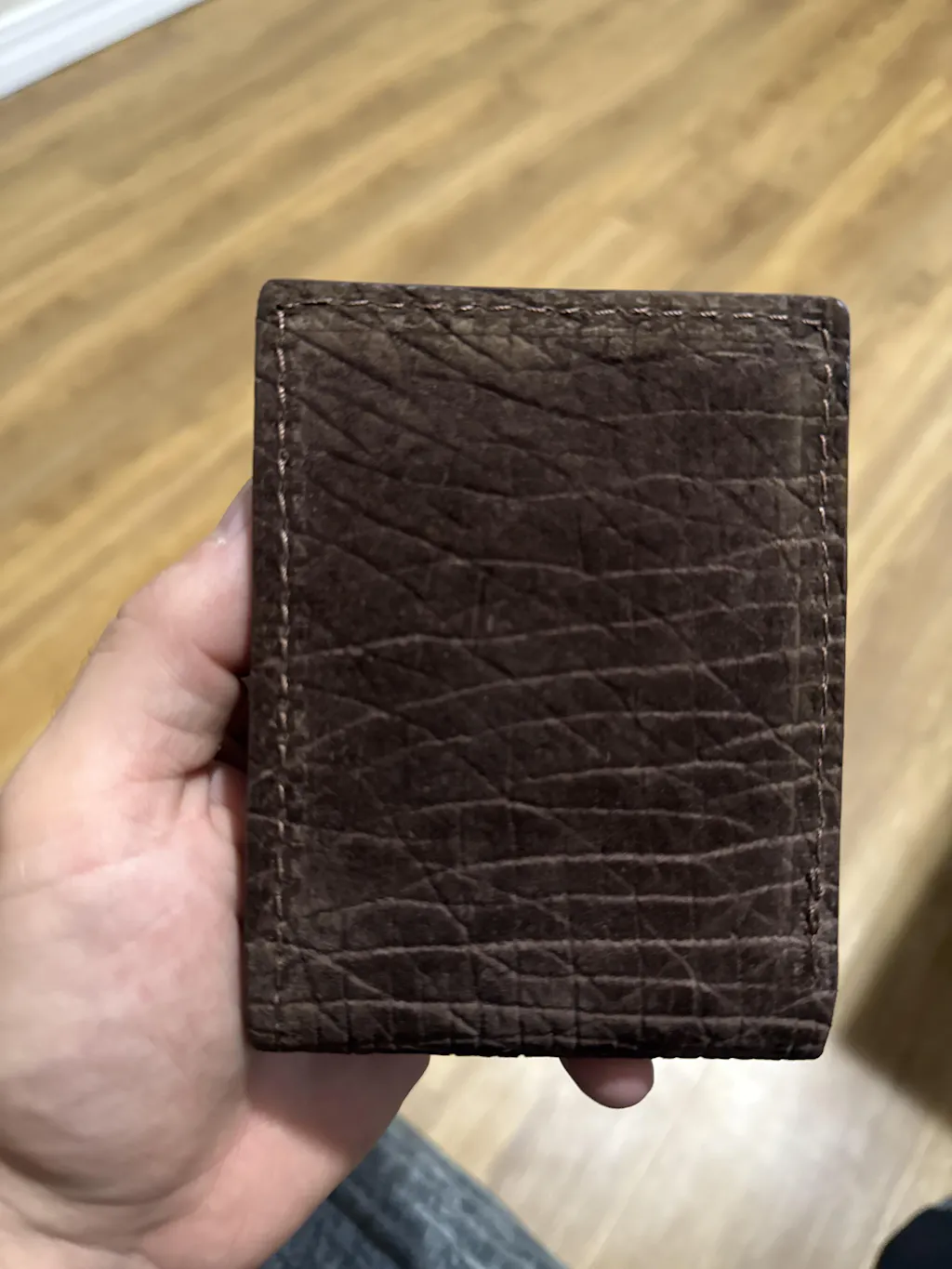 This wallet is made with beautiful authentic hippopotamus leather that is tanned brown. It has a soft suede-like feel. It is stitched with heavy duty nylon thread that matches the color of the leather.
