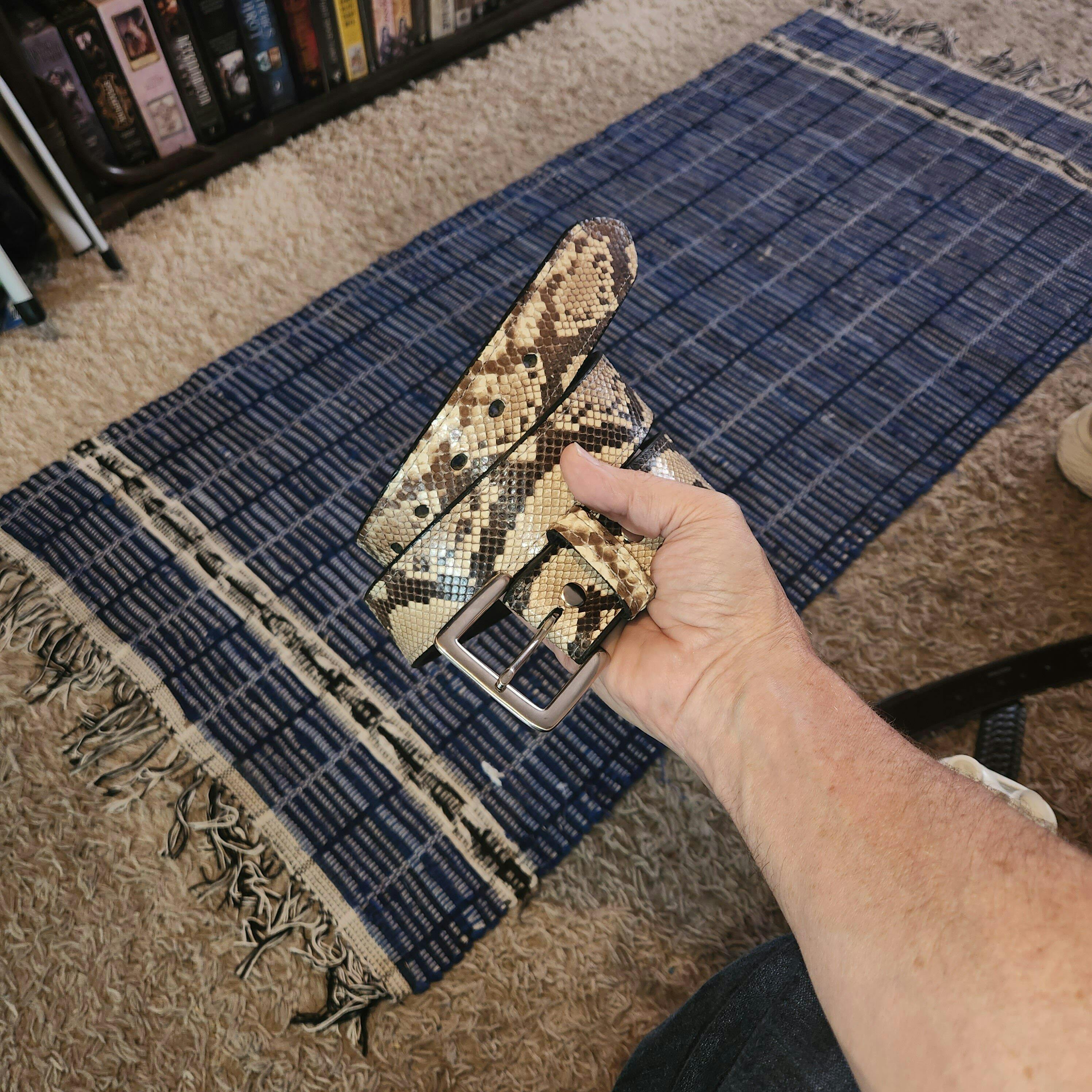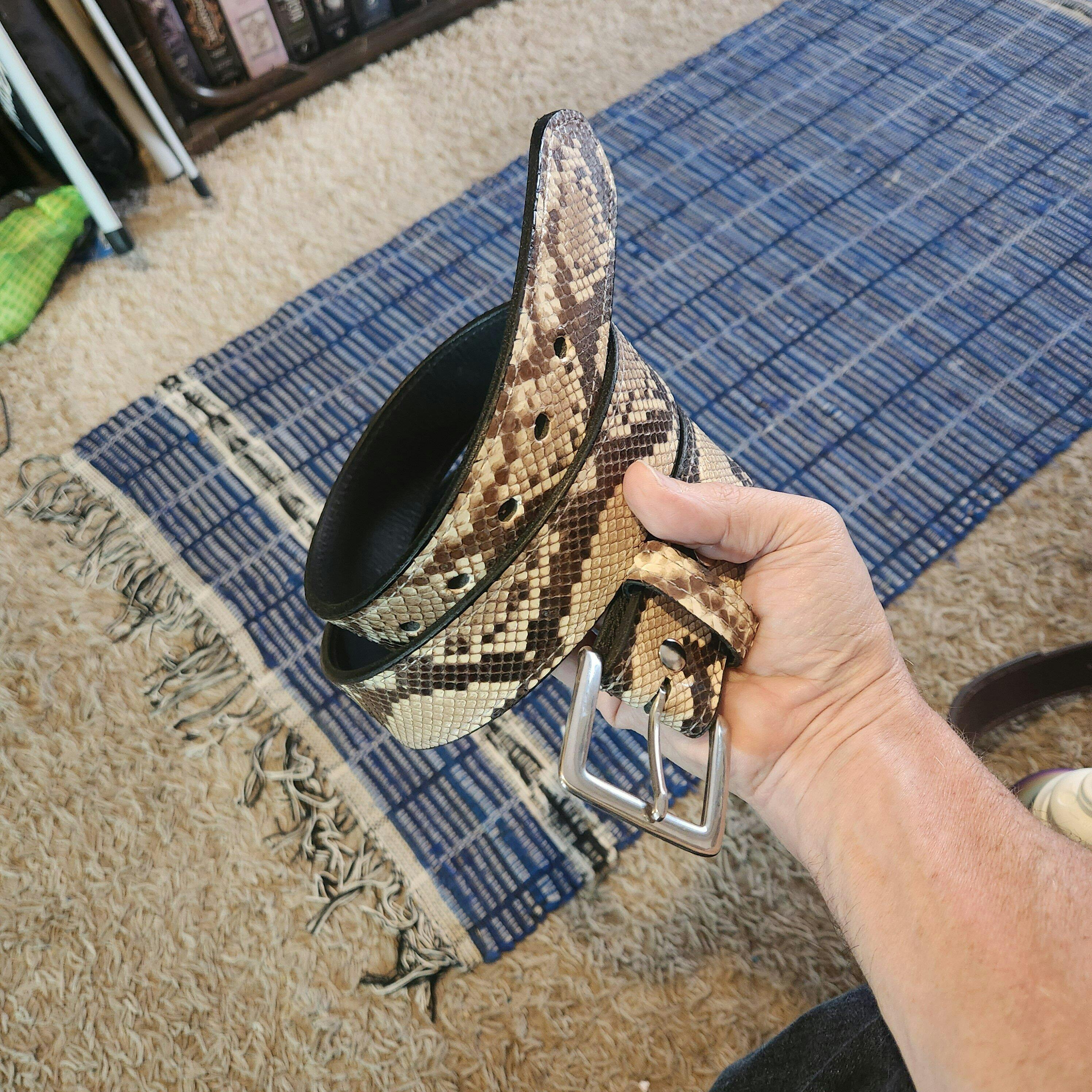 This belt is made from premium python snake leather. Comes with 7 holes spaced 1 inch apart. It comes with a beautiful square chrome over solid brass buckle.
