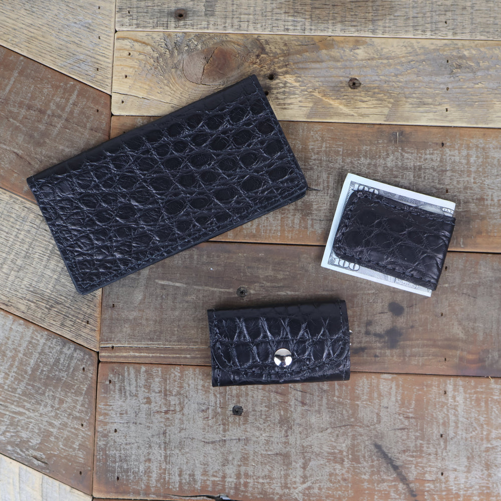 A fantastic gift bundle made for the guy in your life who carries keys, cash & checks. All crafted from matte black genuine alligator leather.