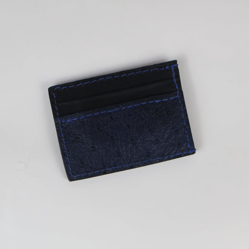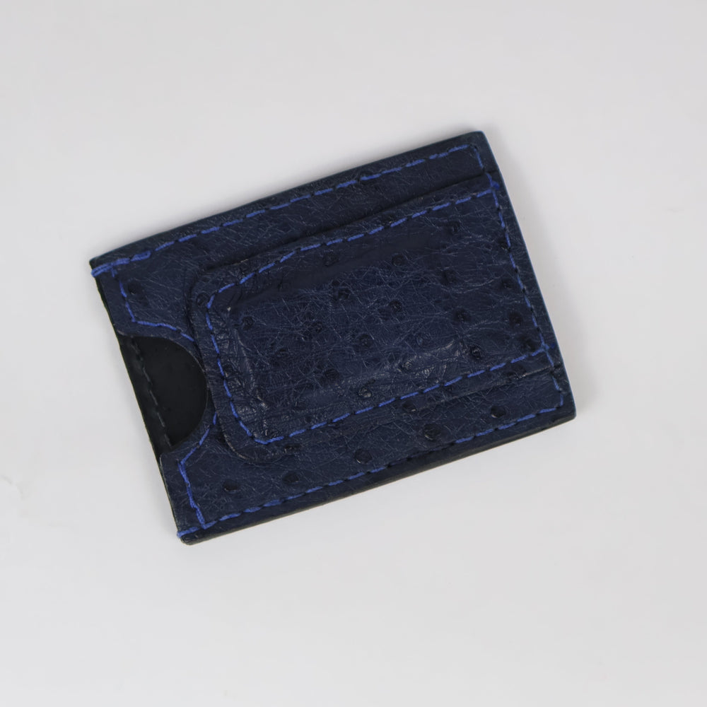 This wallet is made with beautiful genuine ostrich leather that is tanned navy. It is stitched with heavy duty blue nylon thread that accents the color of the leather.