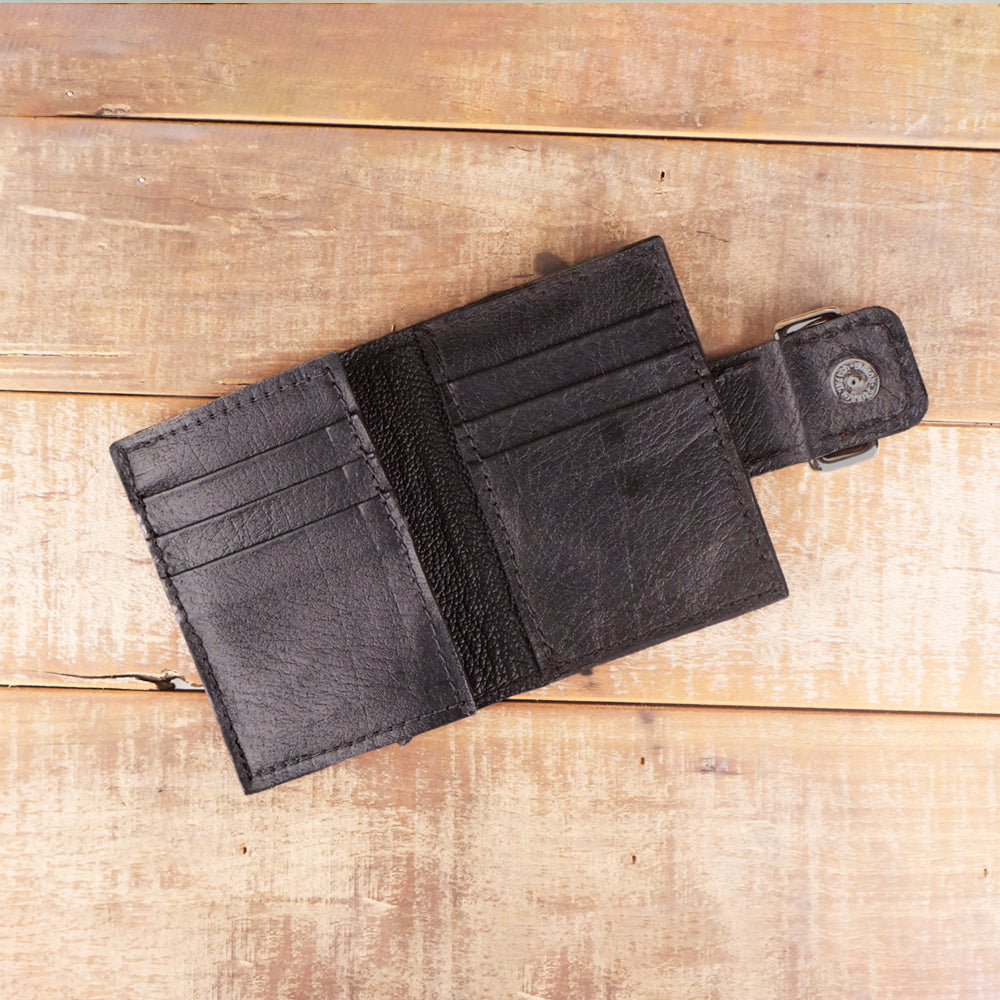 It has 6 wide credit card slots. There is also 2 spaces behind the credit card slots to store additional items. One side is a coin pouch and the other side is a large pocket for cash. A strap with a magnetic snap holds the wallet closed.