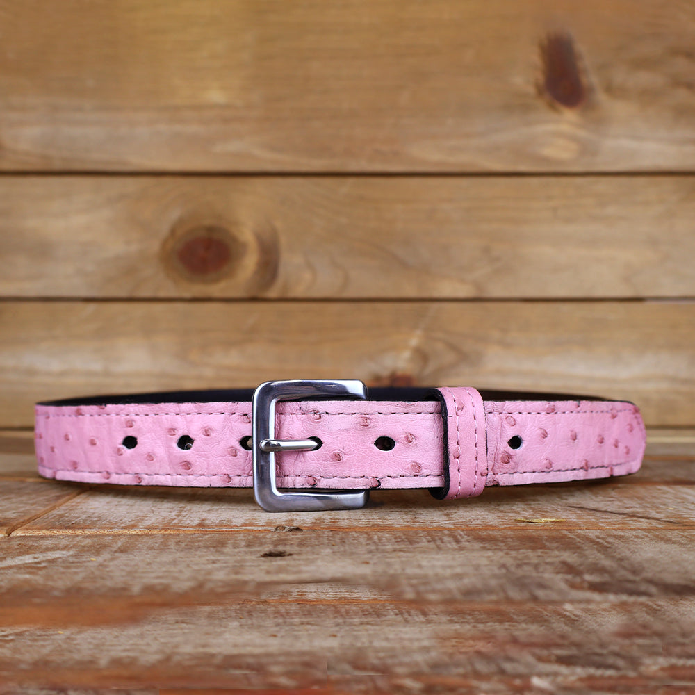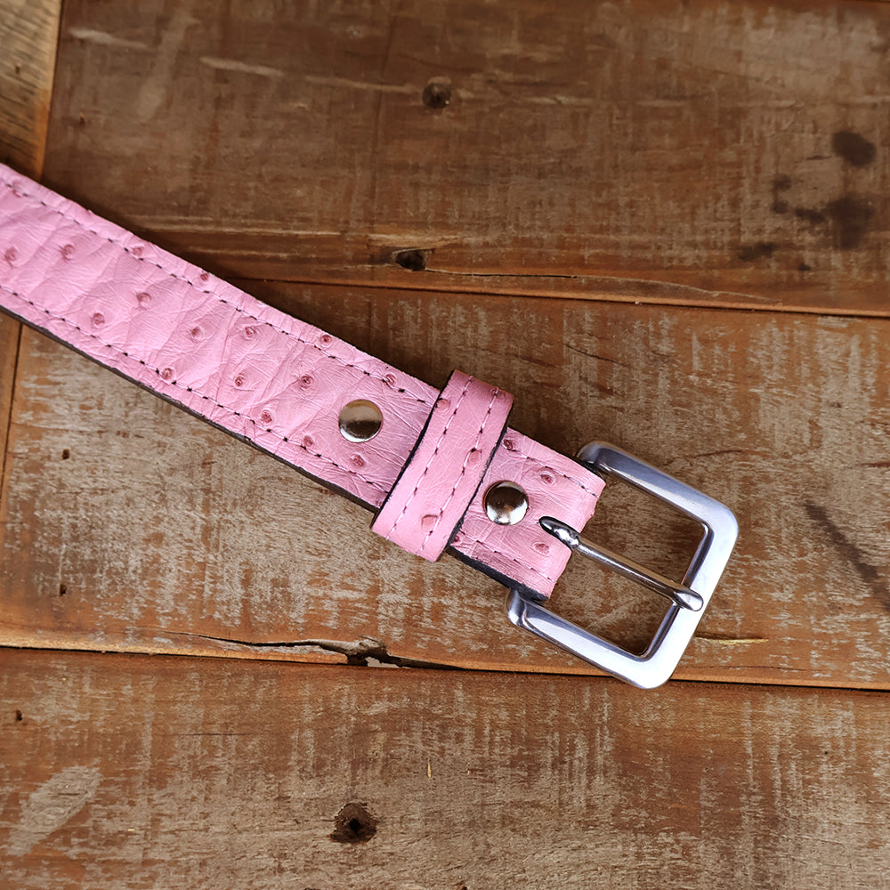 Our belts are handcrafted from the highest quality ostrich skins available. These leather belts are made to order and crafted with our years of leather-working experience. This particular belt is tanned to give it this bright pink color. Available in 6 other colors.